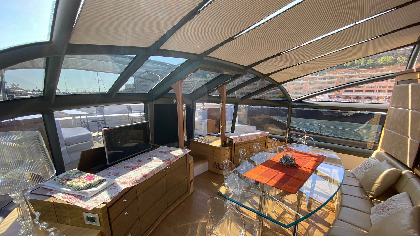 In correspondence with the twin cabins and the VIP cabin there is a very large sundeck and a C-shaped sofa capable of hosting all the guests on board.