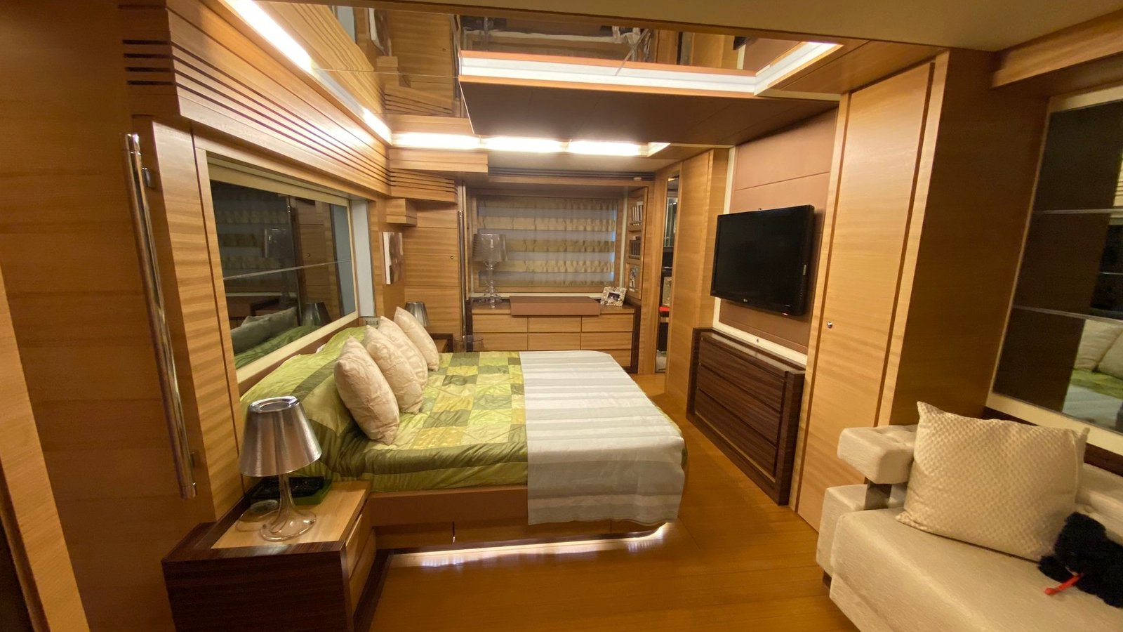 The Master cabin is located amidships towards the bow, full beam, and features a large double bed and two desks, one on each side; in the same area we find two mirrored cabins with twin beds and the VIP cabin, all with private head.