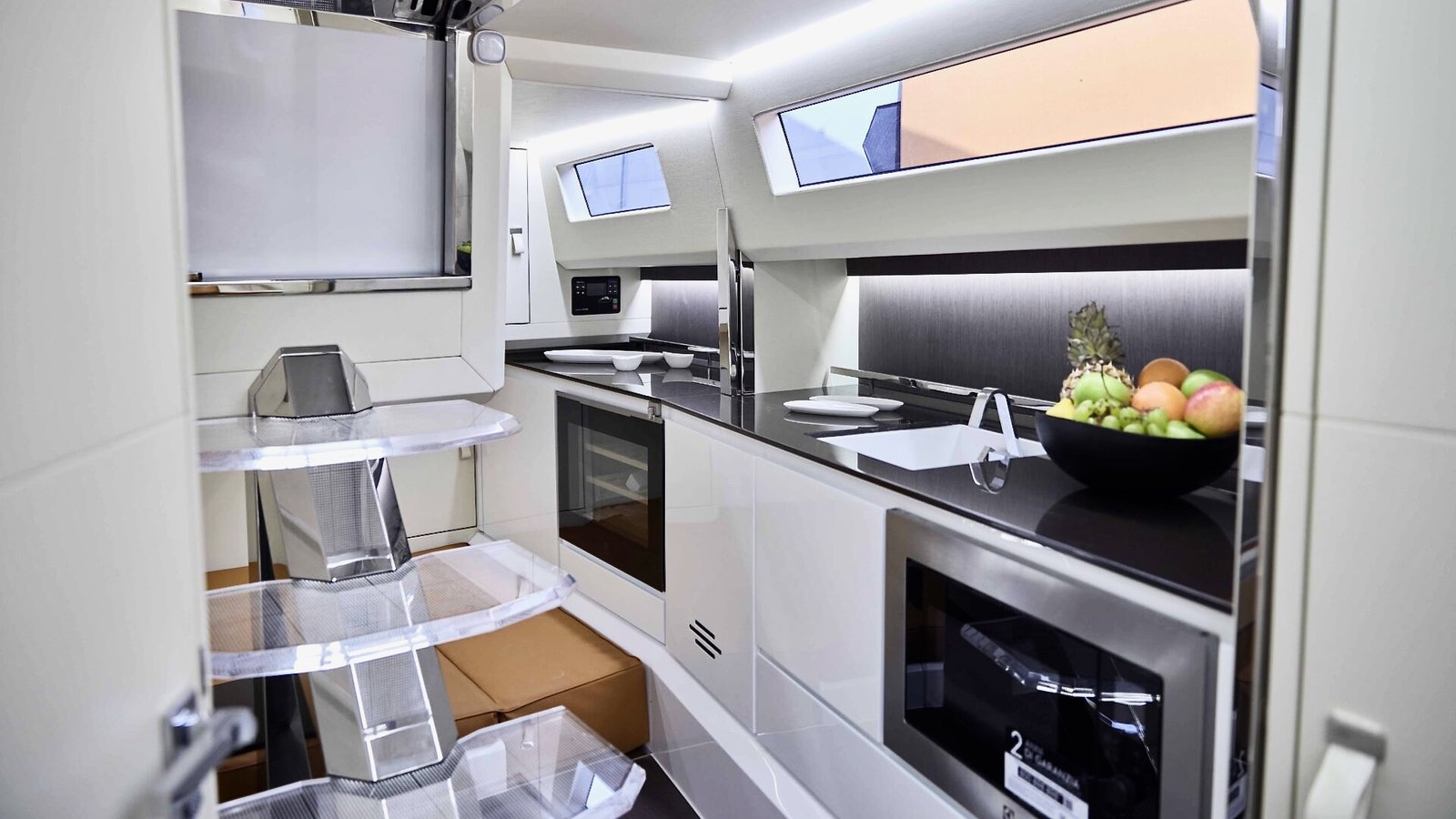 The Evo Yacht R4+ is a meticulously crafted vessel that strikes a perfect balance between aesthetic allure and functional excellence. Its striking silhouette, characterized by sleek, aerodynamic lines, captivates at first glance and seamlessly integrates with expansive deck spaces. The exterior is enhanced by high-quality materials and finishes, including sophisticated gel coats and marine-grade composites, ensuring both visual appeal and durability in the harshest marine conditions.